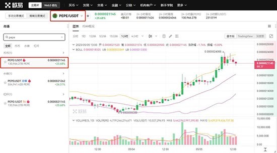 5、输入PEPE币英文简称进行精准搜索,系统将展示多个交易对选项。选择流动性最佳的PEPE/USDT交易对,此时可查看实时买卖盘数据、成交量柱状图以及历史K线走势。建议新手先观察盘面波动规律,设置合理的心理预期价位。