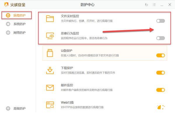 2.进入病毒防护设置界面后,需特别注意两个关键子项:首先定位到【文件实时监控】选项,将其状态切换为灰色关闭模式;接着在相邻位置找到【恶意行为监控】功能,同样进行关闭操作。这两个防护组件会实时扫描安装程序文件,暂时停用可避免安装过程中的扫描干扰。