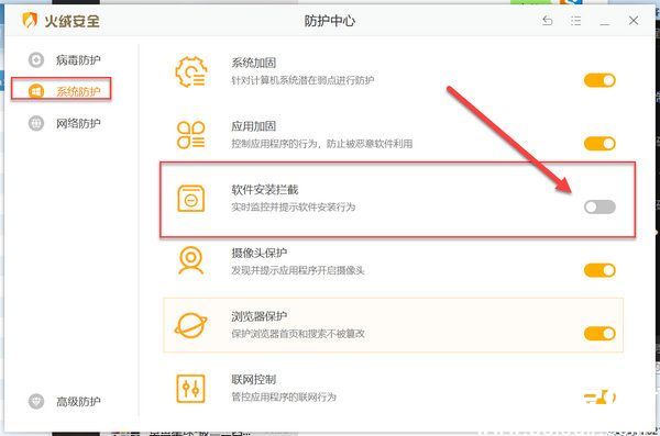 3.切换至系统防护设置界面,在此需要管理软件安装拦截功能。找到【软件安装拦截】选项后,将滑块调整为灰色禁用状态。该设置专门针对未经认证的安装包进行行为分析,临时关闭有助于完成特殊程序的安装部署。
