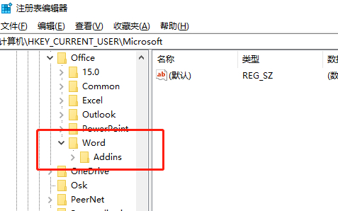 在注册表编辑器界面,依次展开HKEY_CURRENT_USER > Software > Microsoft > Office > Word分支,选择Addins子项进行后续操作。